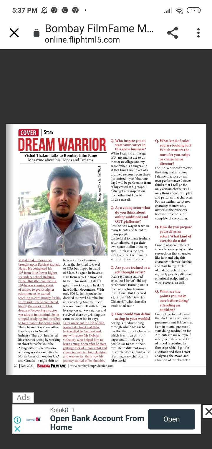 I have started my career in the field of Acting from a junior Artist in a Tv serial called JAGAT JANANI MAA VAISHNO DEVI I have worked there for 6 months and Upto yet I have done two webseries that is One U- TURN and Another RAAZ MAHAL. |