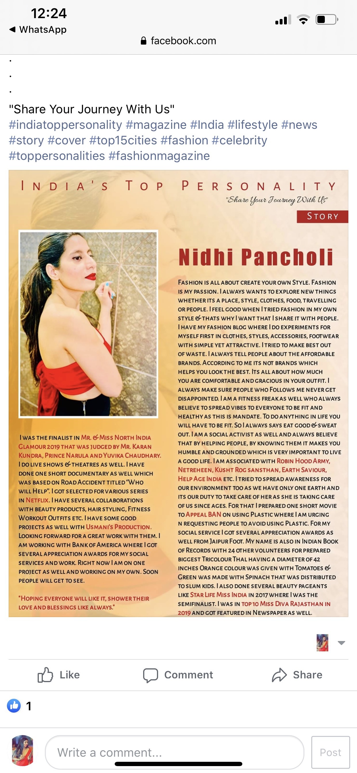 I am Nidhi Pancholi from Jaipur. My passion is acting. I want to do hard work to learn things with big names and I am |