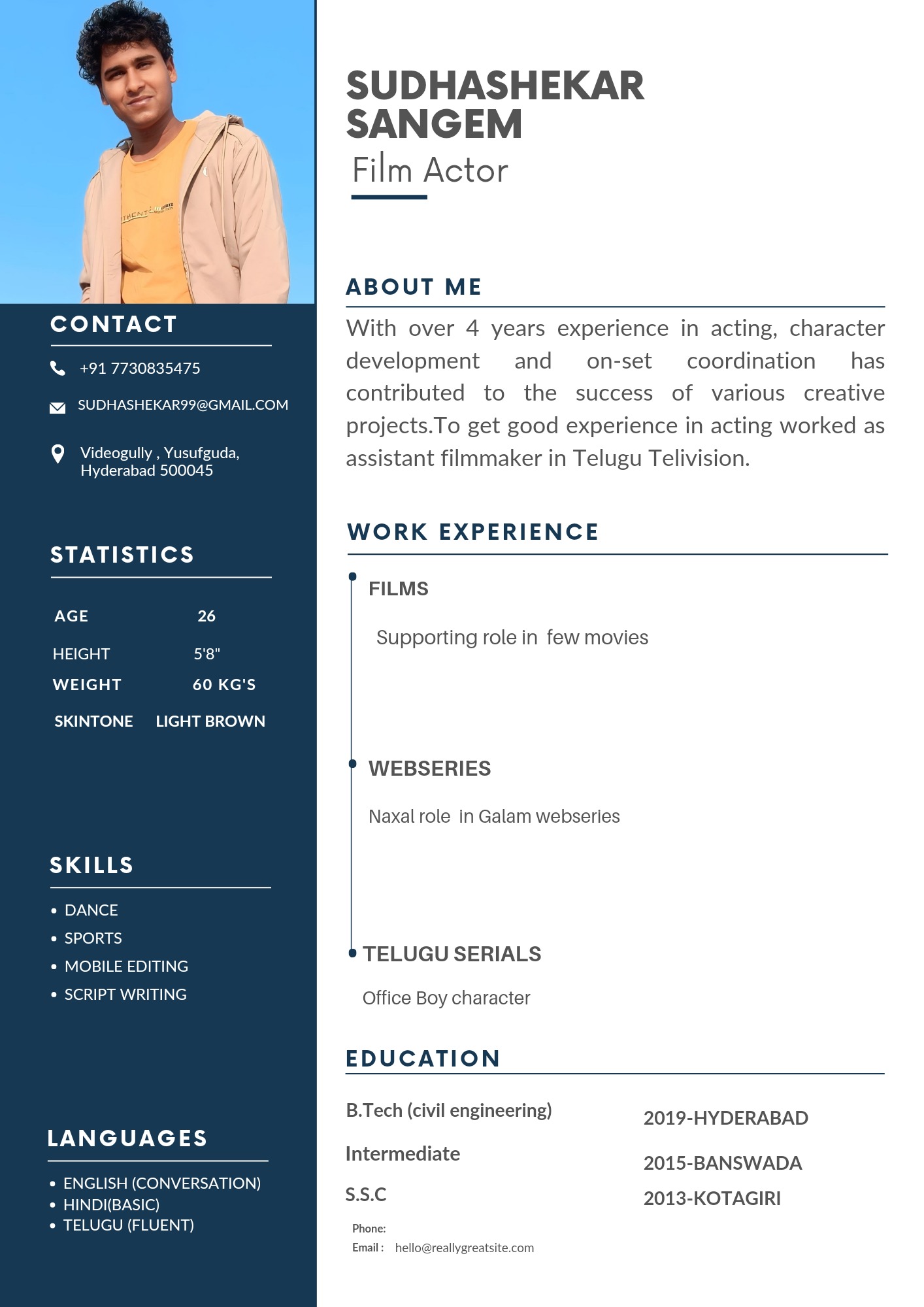 My name is sudhashekar, in one word Iam passion at acting.. and becoming an extraordinary actor it's my dream that's it. |