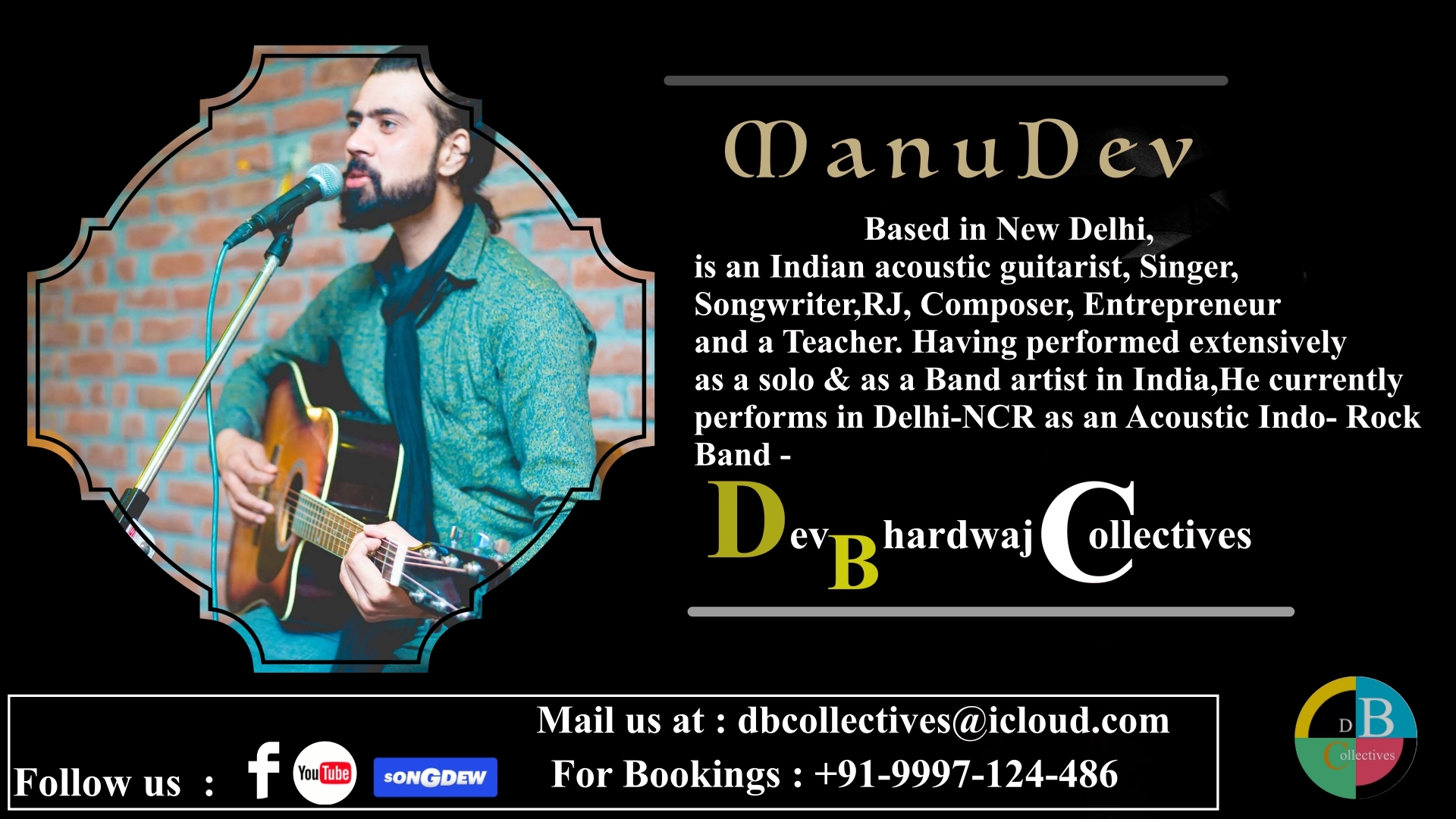 --- ManuDev: --------------- Based in New Delhi, ManuDev is an Indian acoustic guitarist, singer, songwriter,RJ, composer, entrepreneur and a teacher. Having performed extensively as a solo & as a Band artist in India,He currently performs in Delhi-NCR as an Acoustic Pop Rock Band Dev Bhardwaj Collectives |