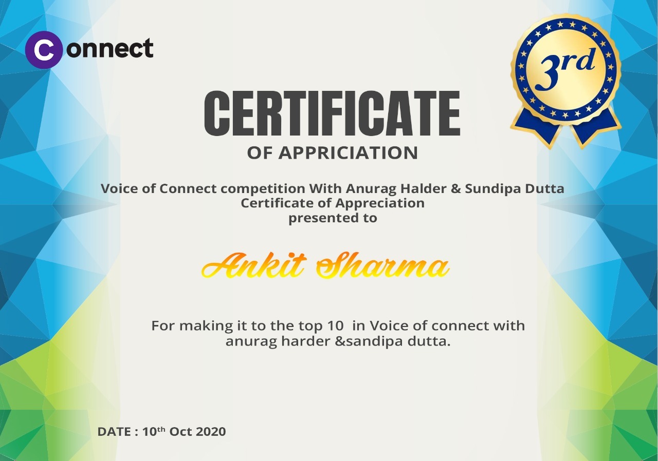 I am Ankit Sharma and recently during Lockdown i am in Top 3 in Online Singing Competition organized by Connect Community which has more than 10,000 Subscribers on Social Media Platforms. |