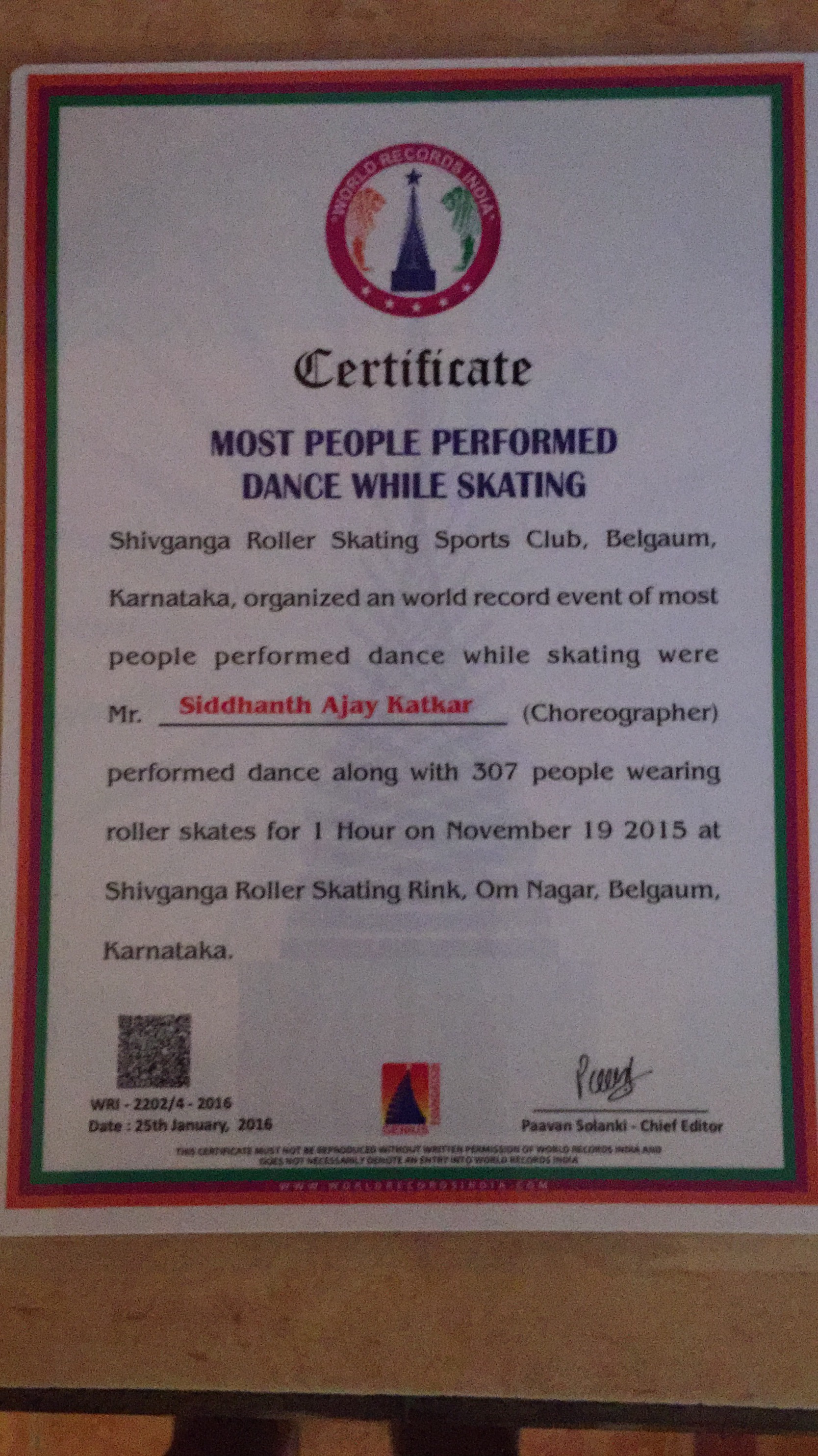 Achievements;being choreographer made 1 world record of India, into the world record books of India,(307 students of one skating club performed together on skates for 1hr). |