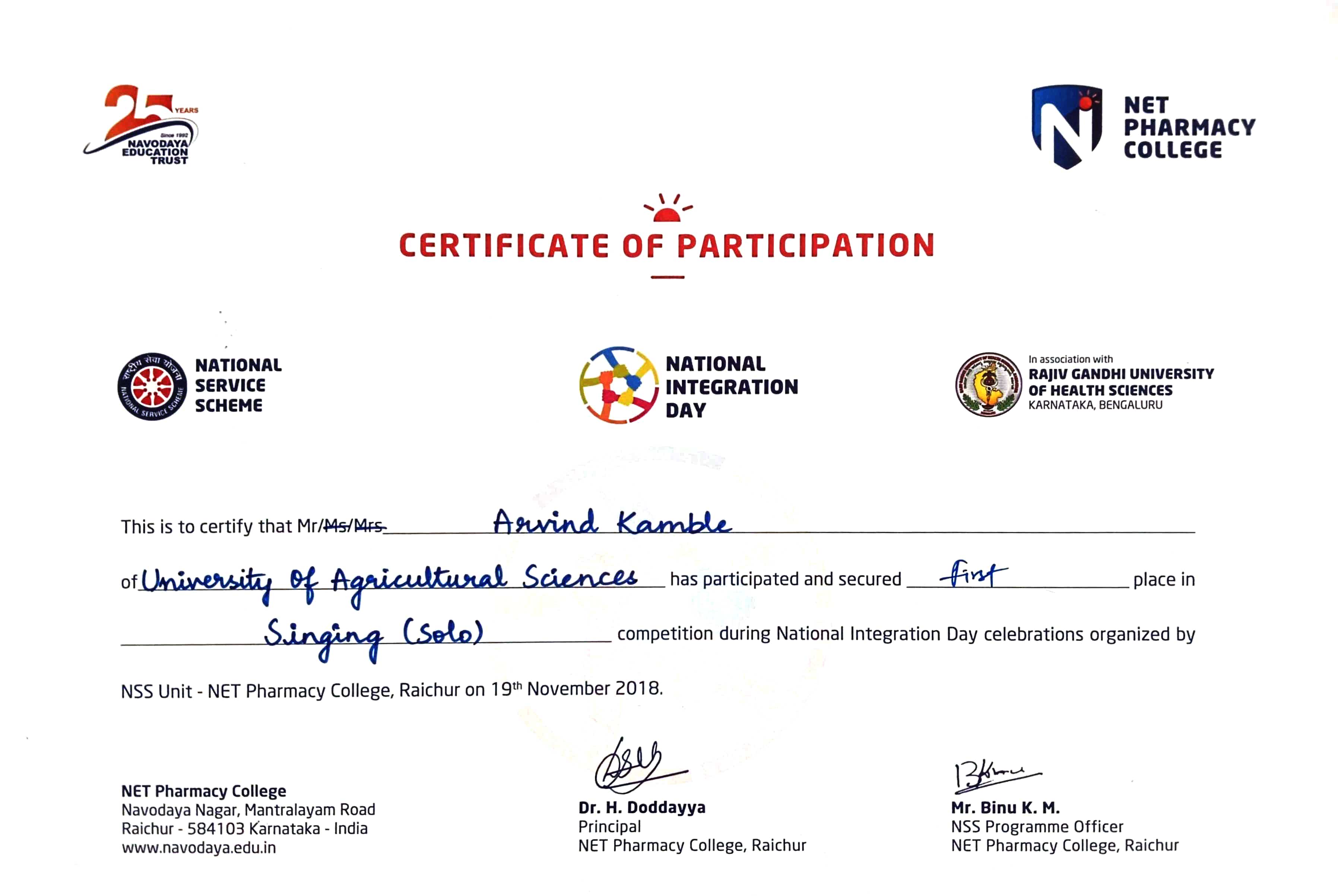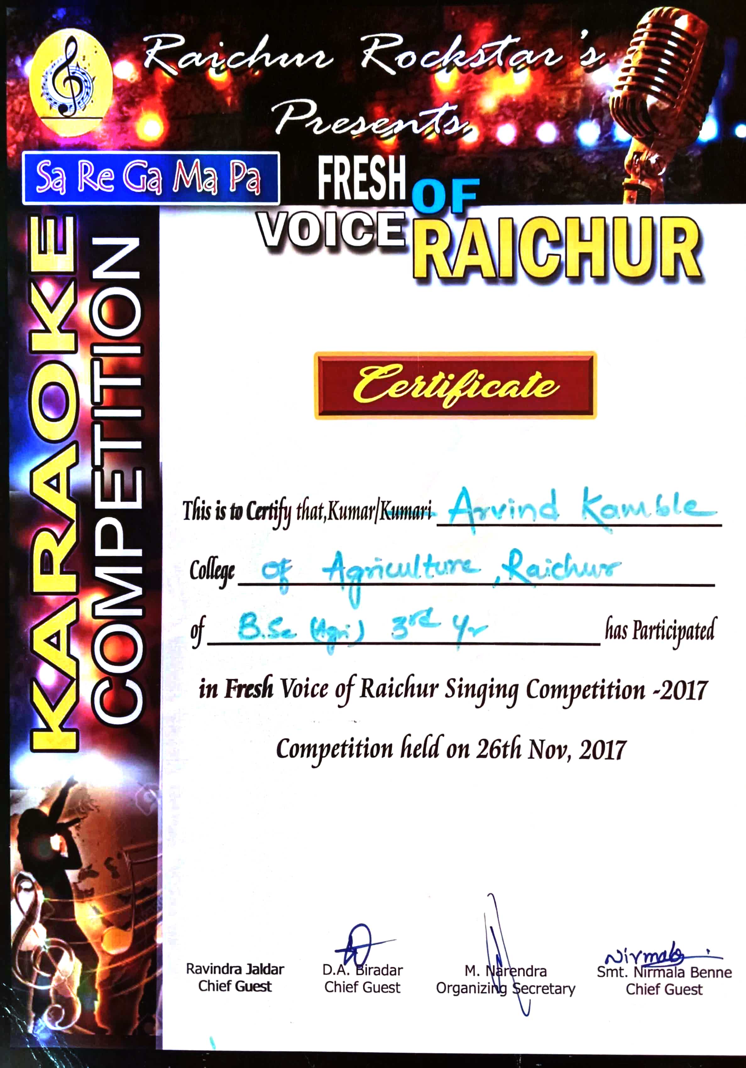 I love Singing || Stage Performer || Finalist in 2017 Fresh SaReGaMaPa karaoke Voice of Raichur Karnataka || Intercollegiate Youth Fest Performer, participated many competitions and secured Prizes & certificates | Loves to sing different languages songs | |