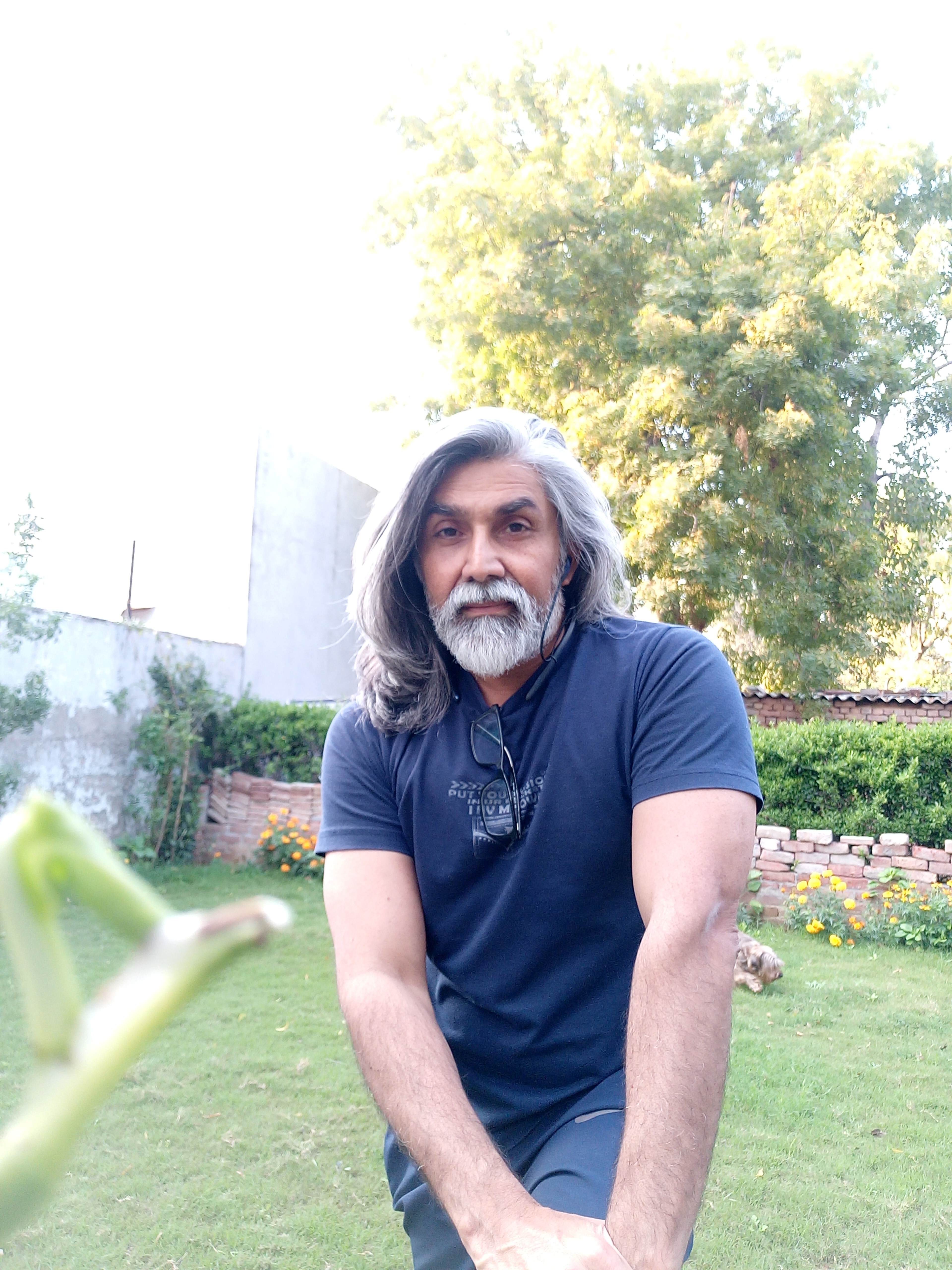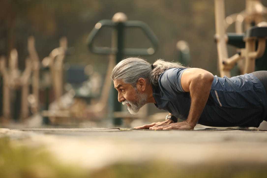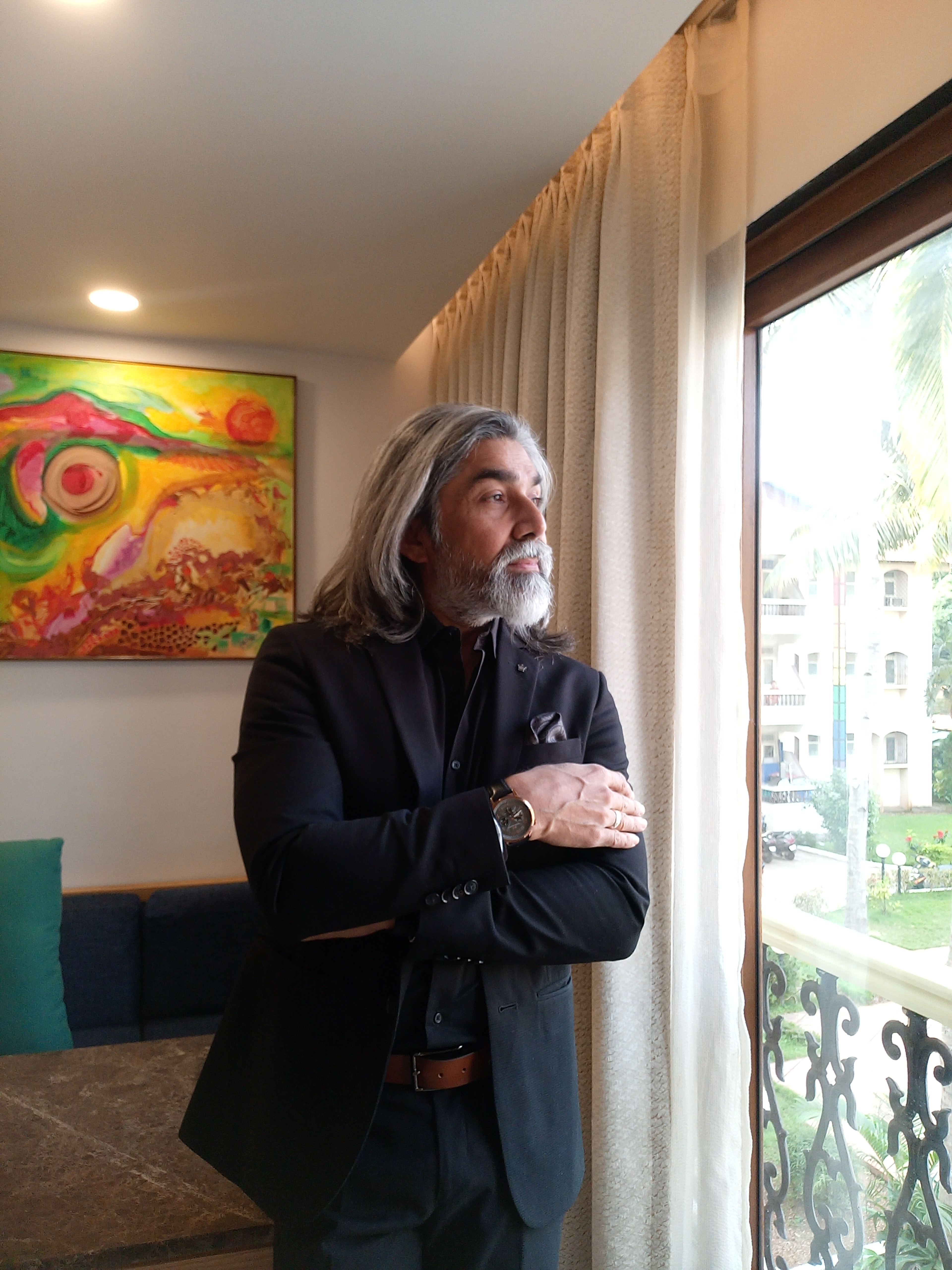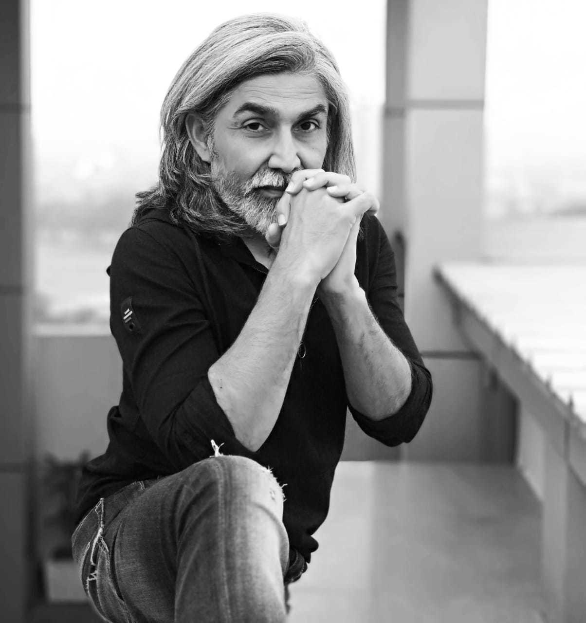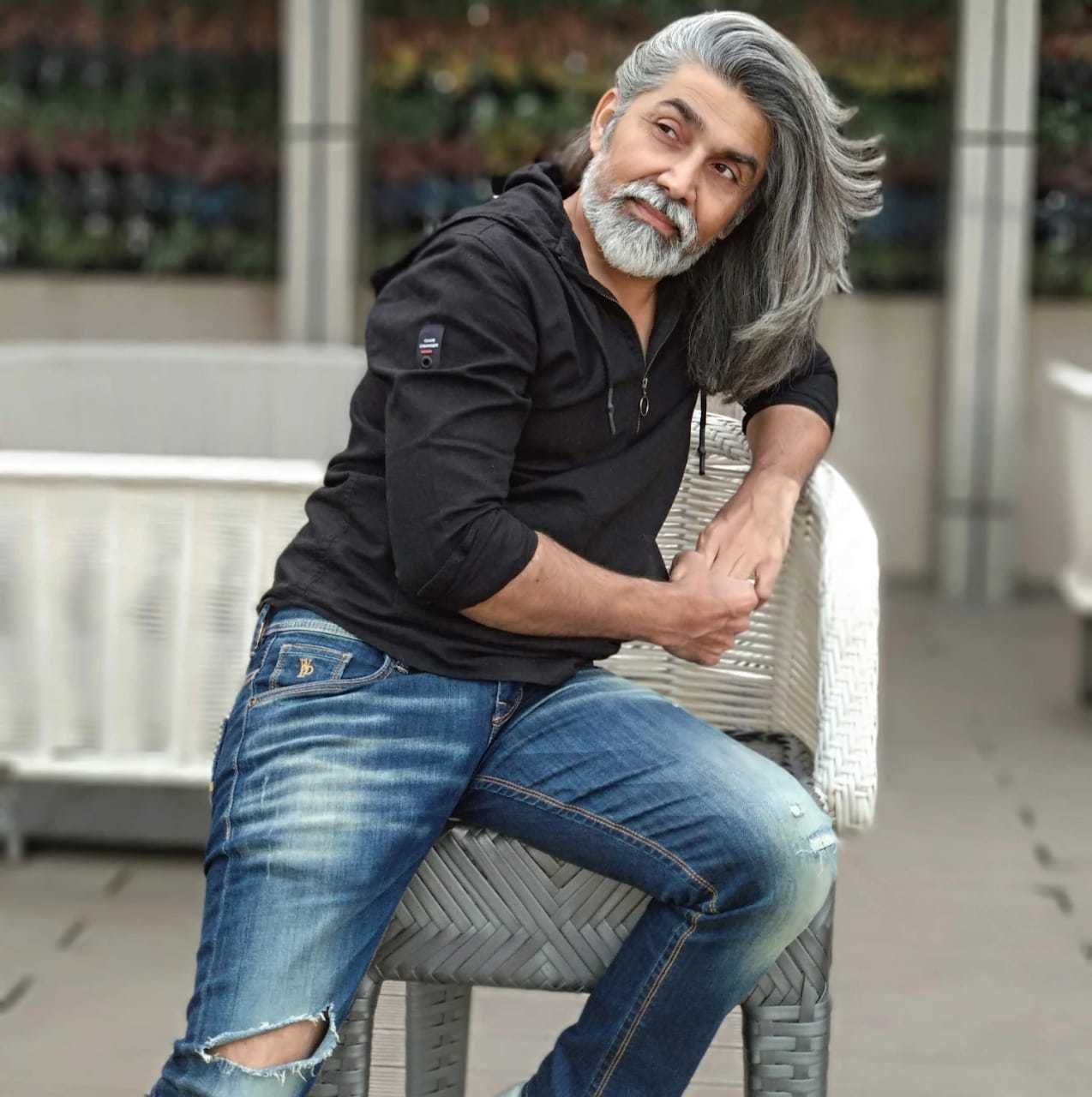 Intense actor with lean physique & high level of fitness at 50 years with dense grey hair & beard. |