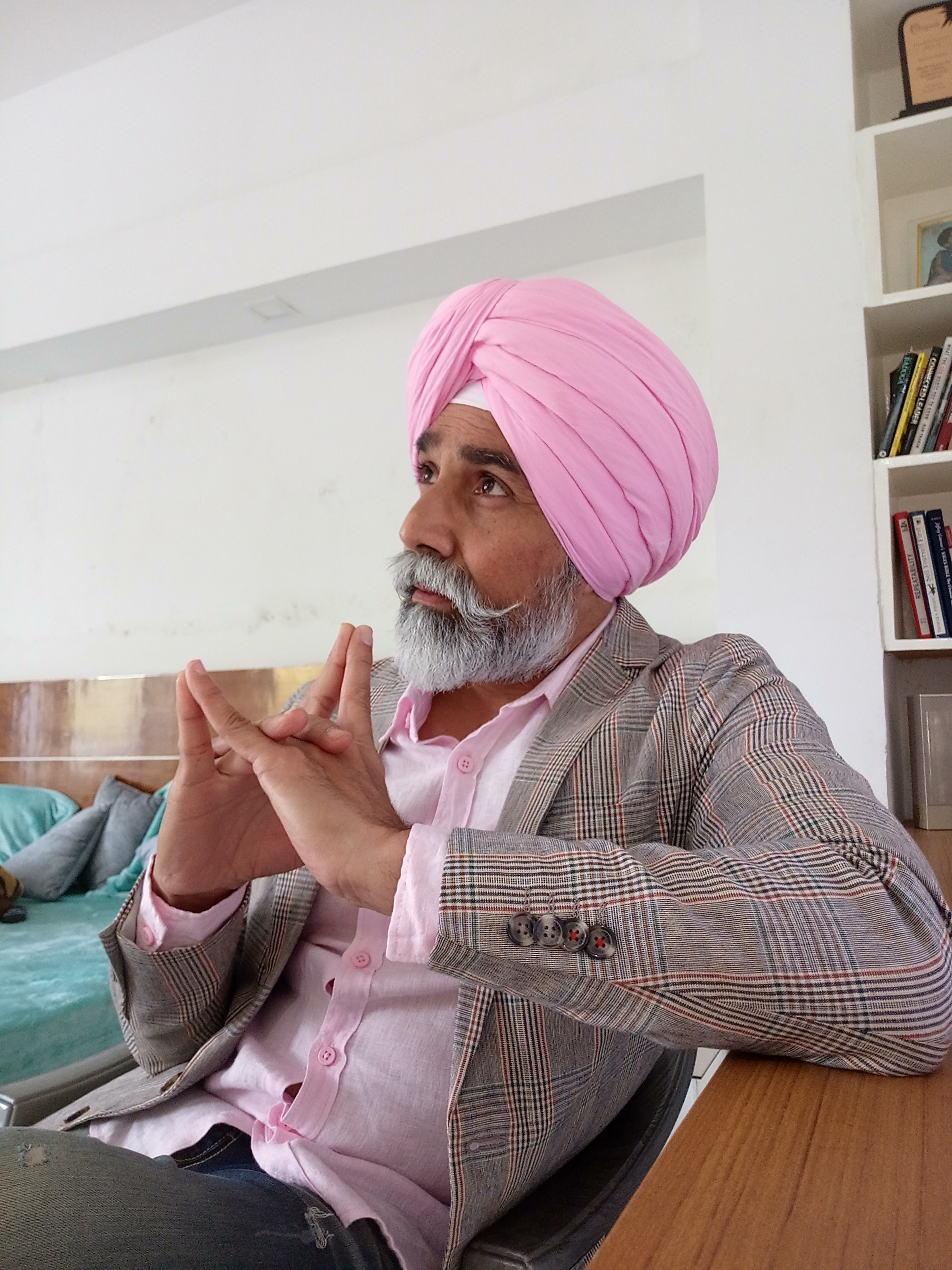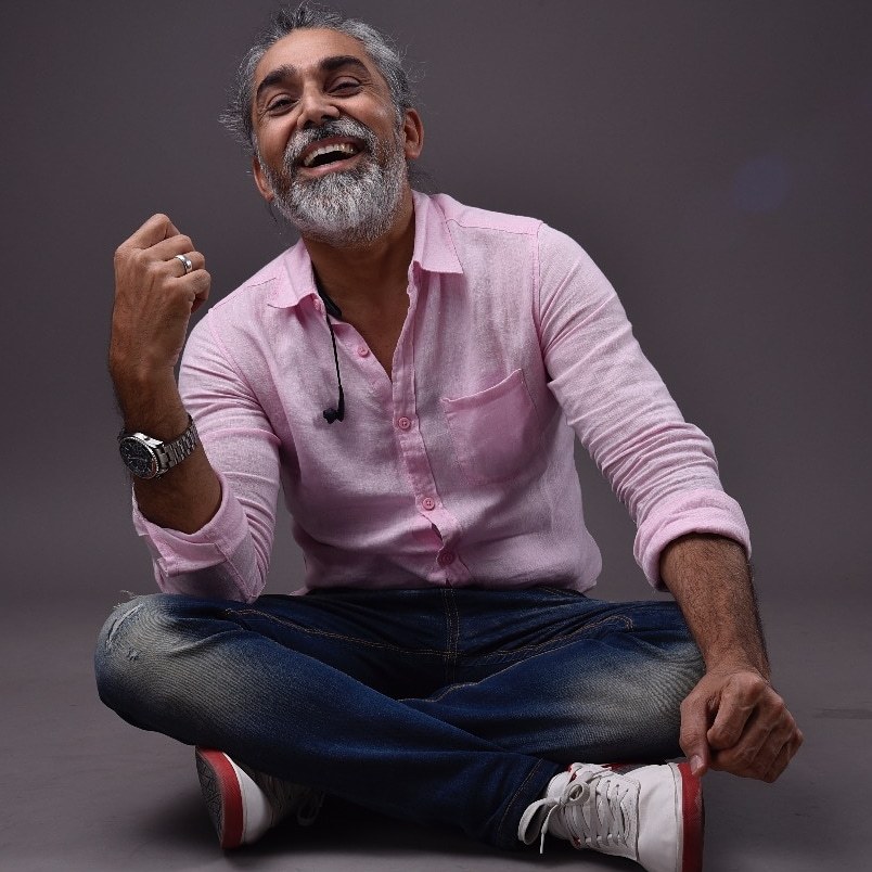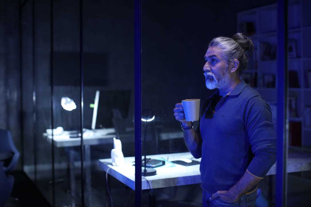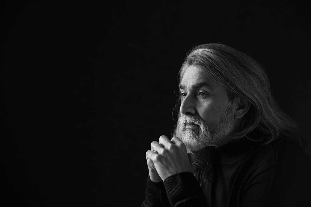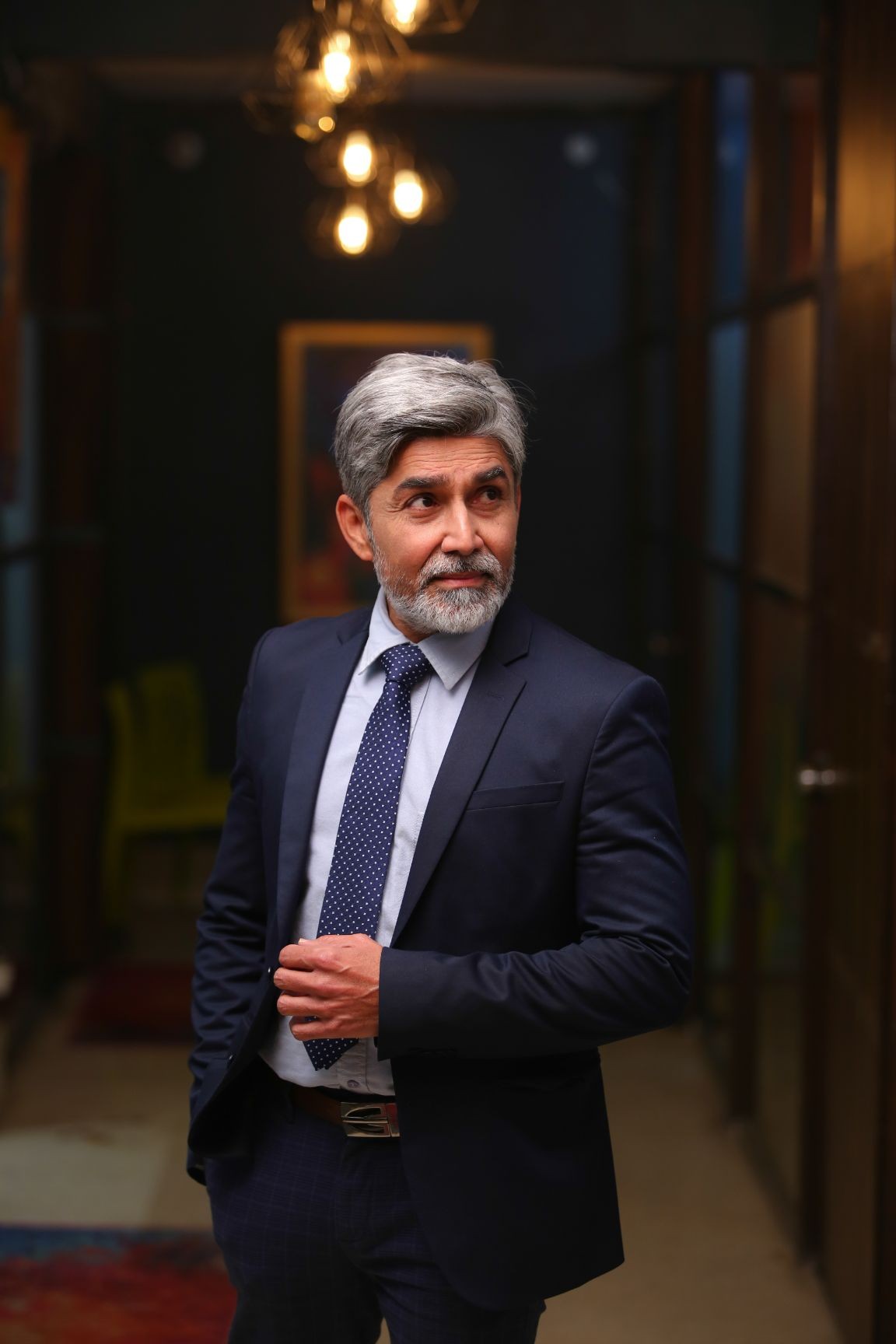 Intense actor with lean physique & high level of fitness at 50 years with dense grey hair & beard. |