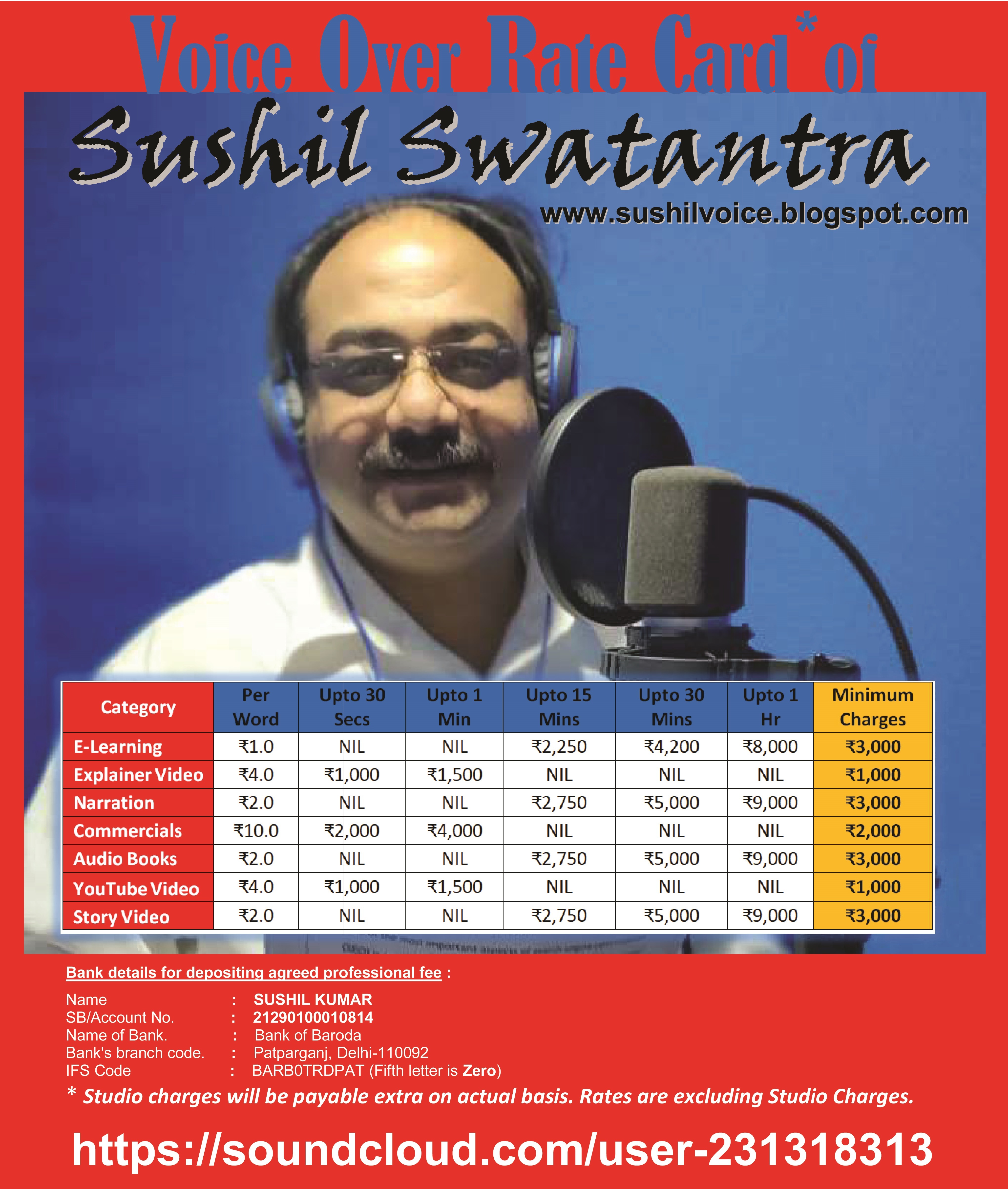 I am a Delhi based voice-over and dubbing artist. I have baritone lead voice. I can be available in other cities if it is required for the project. I can record voice over projects in my mini studio and deliver online within the agreed timeframe. I mainly work in HINDI language. I have experience of offering my voice for YouTube channels, explainer videos, e-learning videos, academic audios, dramatic voice over projects, documentaries, children stories, advertisements, audiobooks and story narration etc. Following is my SoundCloud profile : https://soundcloud.com/user-231318313 |